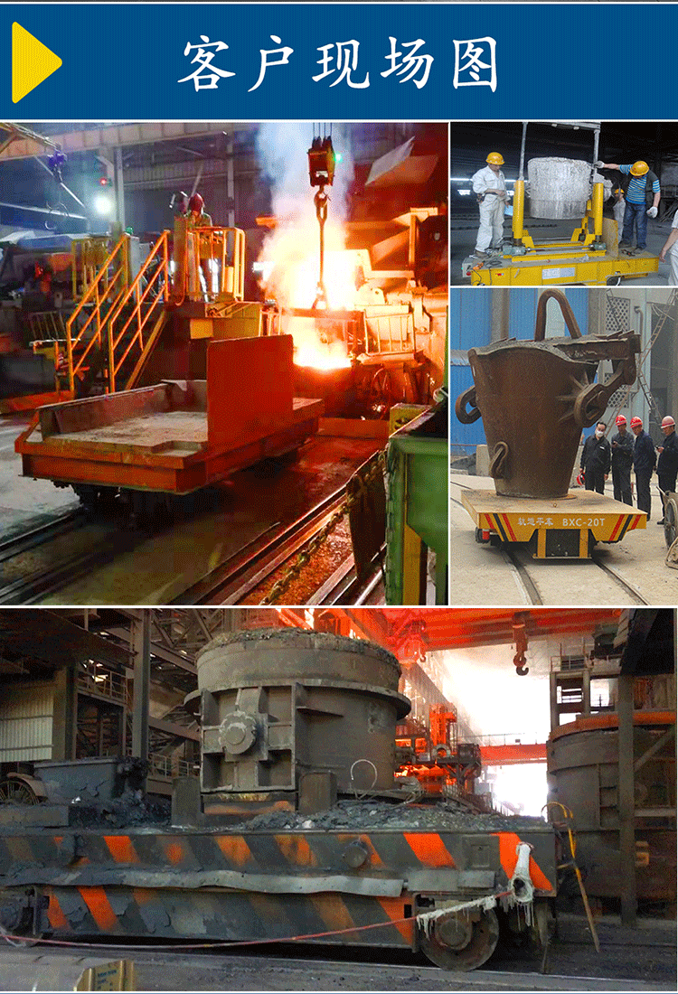 鋼包車是一種專為各大鋼廠、銅廠及冶煉廠、鑄造廠設(shè)計制造的一種運輸高溫包體軌道式運輸工具,在客戶不同的需求下可以按照包體的大小尺寸、重量和環(huán)境溫度、包體外部溫度等條件量身定制,也可以按照不同需求及客戶方提供的圖紙制作。當然,環(huán)境不同鋼包軌道車的制作方式也不同,通常環(huán)境溫度在100度以上的可選用電纜卷筒或拖電纜供電,這兩種供電方式的鋼包軌道平車可耐100-1000度的高溫,電纜線選用強度的耐高溫電纜,其電機、減速機及電控箱都采取隔熱防護措施,以避免在高溫環(huán)境下受損,影響臺車的正常使用。